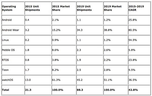 Дальше интереснее: уже к 2019 году продажи умных часов от Apple возрастут до 45 устройств, что станет абсолютным рекордом на рынке. Аналитики отмечают, что Android Wear тоже ждёт успех, но не такой большой – 34 миллиона отгруженных устройств.