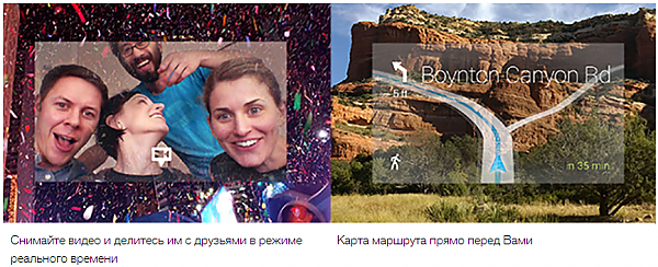 С Google Glass множество функций будут доступны вам прямо на ходу. Прогуливаясь по улице, вы сможете общаться с друзьями, делать снимки и записывать видео, и, не остановившись ни на секунду, отправить их любому адресату, а благодаря GPS-навигатору, вы в любой момент сможете получить интересующую вас информацию о маршруте. Не удивительно, что вы так же можете «загуглить» что-то, не отрываясь от пути.